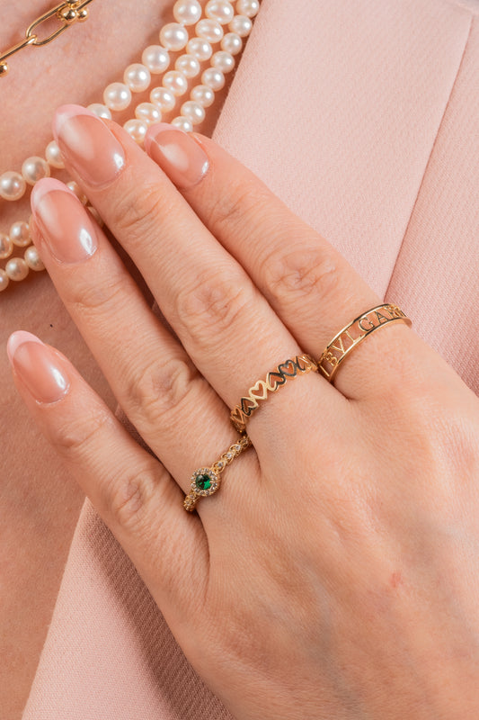 Anillo de oro sólido en 10 kilates con forma de corazones intercalados huecos, arriba y abajo.