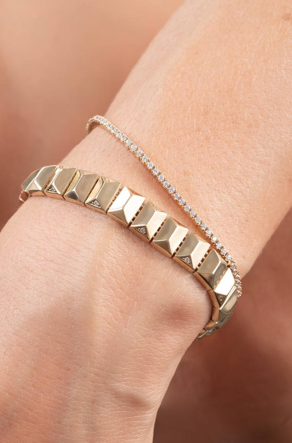 Pulsera 10 kilates con tejido de espinas lisas y centro V´s de zirconias.