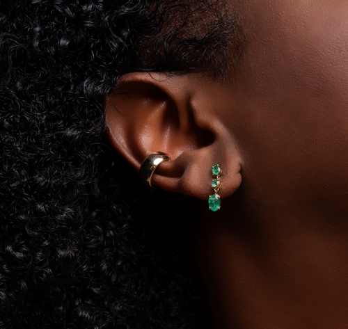 Arete en 14 kilates con corte cuadrado chico con una esmeralda en el centro circular con un contorno de brillantes.