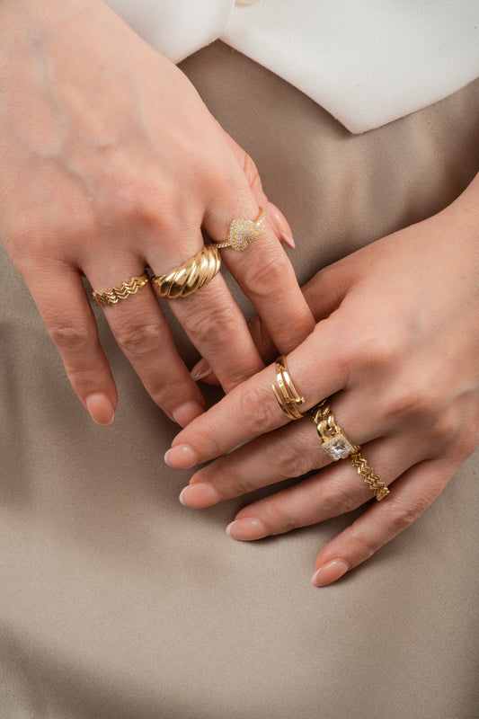Anillo de oro sólido en 10 kilates con líneas enlazadas onduladas en oro amarillo, oro rosa y dos de churumbela.