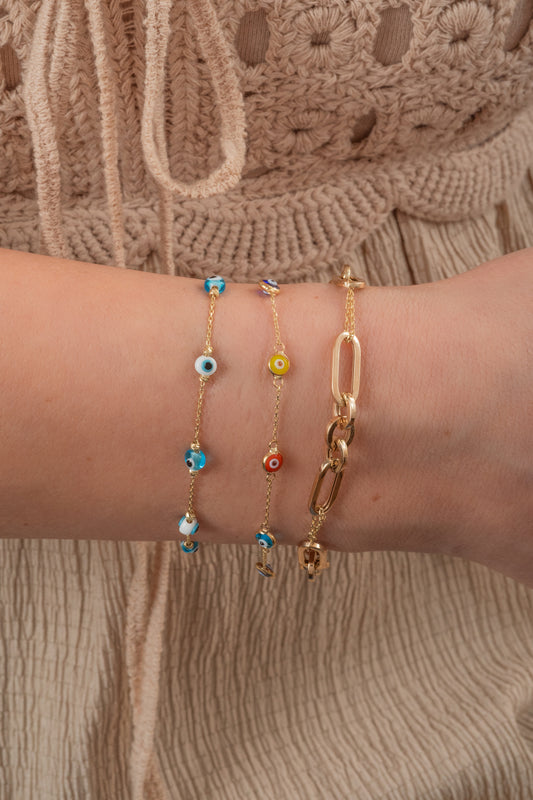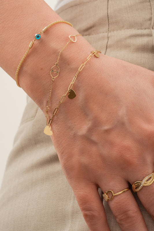 Pulsera de oro sólido en 10 kilates con dije de corazón, placa con ojo y mariposa