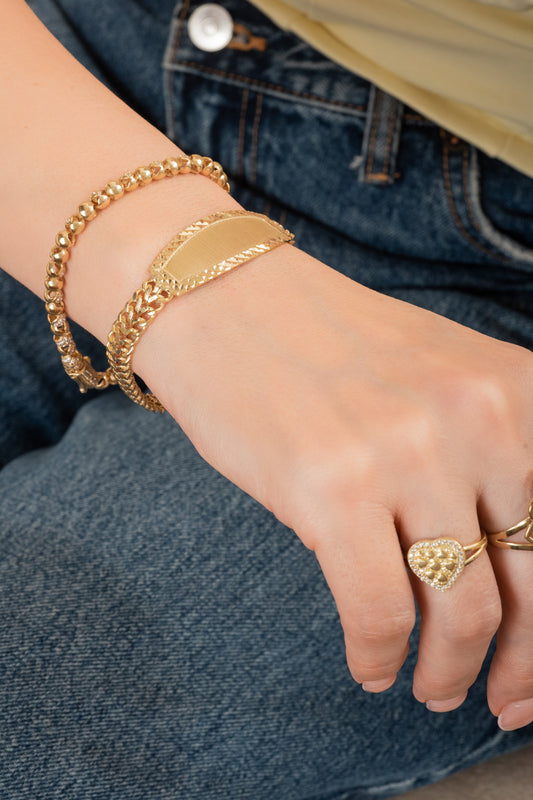 Pulsera de oro sólido en 10 kilates con eslabón de esferas enlazadas y zirconias blancas en forma de semilla.