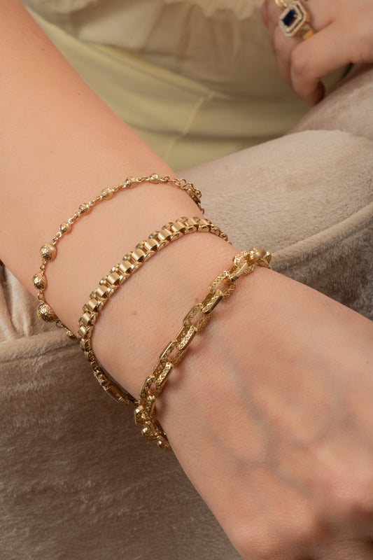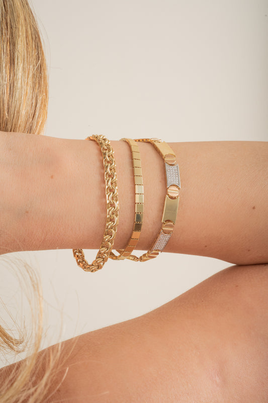Pulsera de oro sólido en 10 kilates con tejido rolex y eslabones gruesos con clavo al centro.