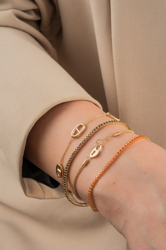 Pulsera de oro sólido en 10 kilates con tejido tenis zirconias naranjas.