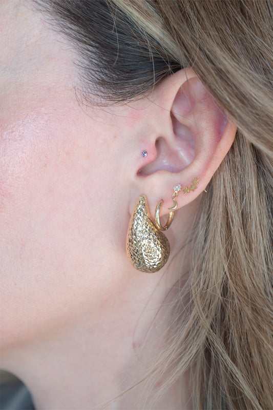 Aretes de oro sólido en 10 kilates gota grande con diamantado en cuadros.