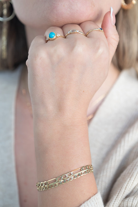 Anillo 14 kilates con brazo fino y centro piedra turquesa circular y tresillo zirconias laterales.
