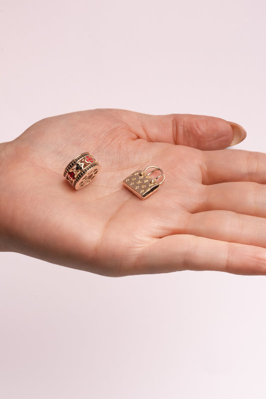 Dije 10 kilates forma de bolsa y letras LV negras y al reverso flores lisas