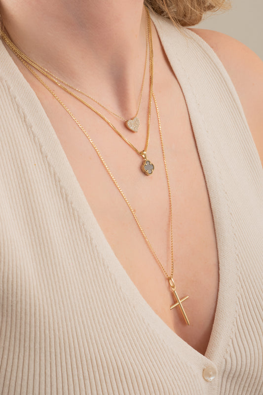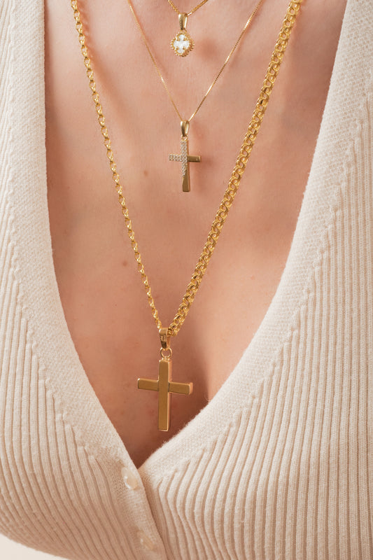 Dije de oro sólido en 10 kilates con forma de cruz mitad lisa y mitad zirconias.
