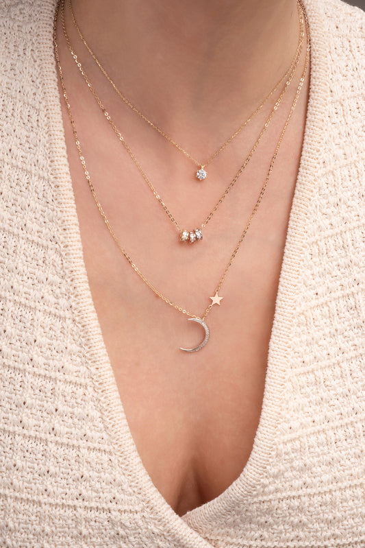 Gargantilla 10 kilates dije de luna en oro blanco grande con zirconias y estrella oro rosa placa lisa