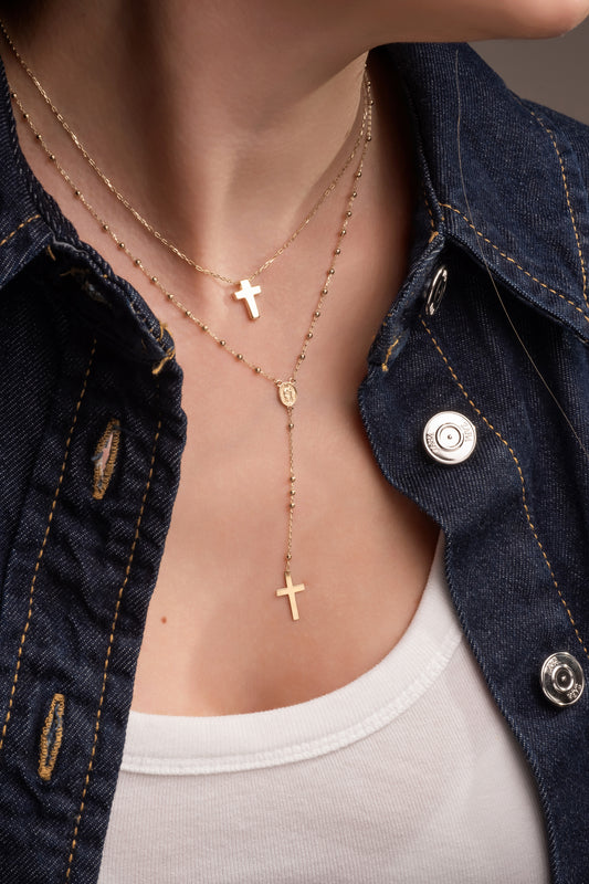 Gargantilla 10 kilates estilo de rosario mediano, estilo diamantado y cruz lisa.