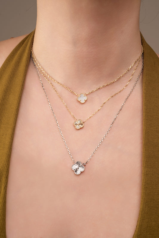 Gargantilla 14 kilates una flor de cuatro pétalos al centro en oro blanco.