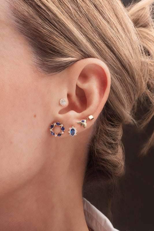 Arete de oro sólido en 14 kilates con circulo de zafiros ovalados y diamantes de 0.15 ct.