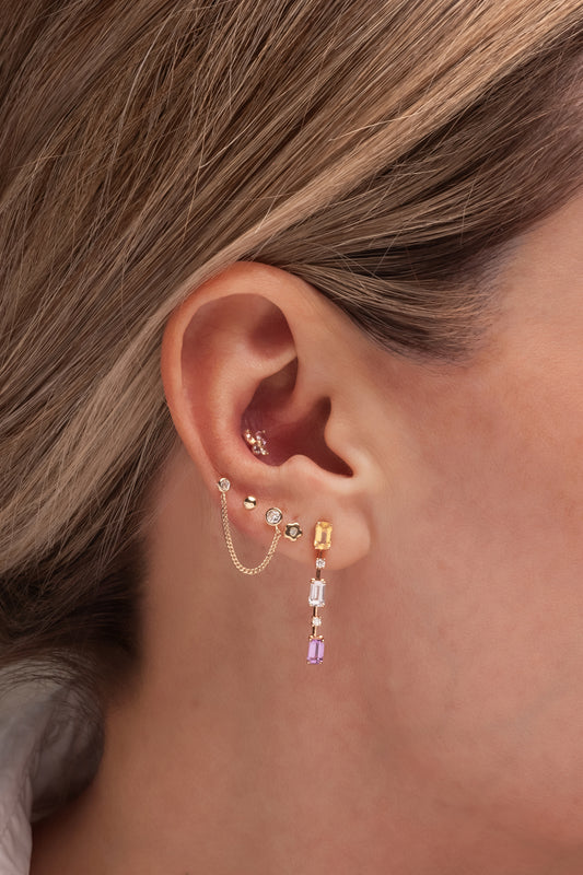 Arete de oro sólido en 18 kilates con tres zafiros de colores mix 1.98 y diamantes SI 0.07 montados en oro 18k.