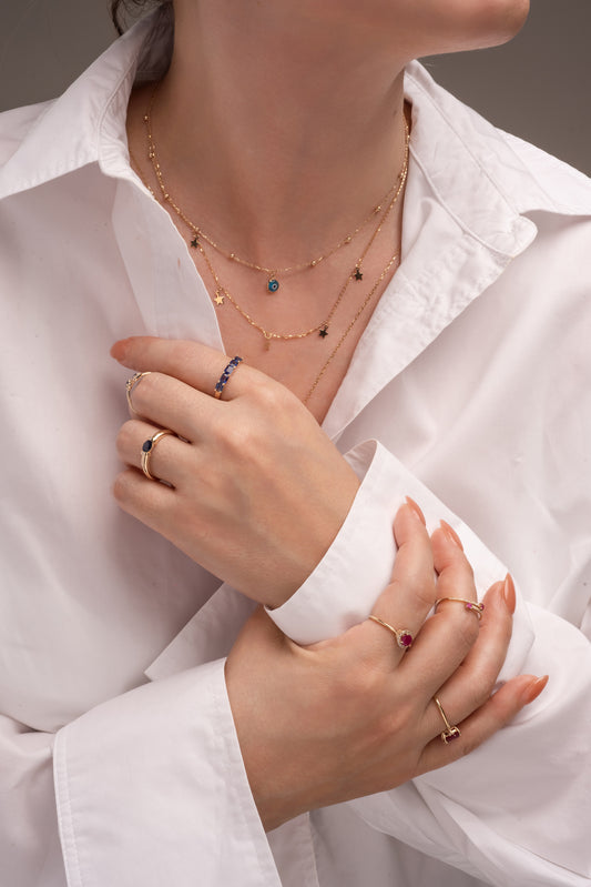 Anillo de oro sólido en 14 kilates con seis amatistas biseladas.