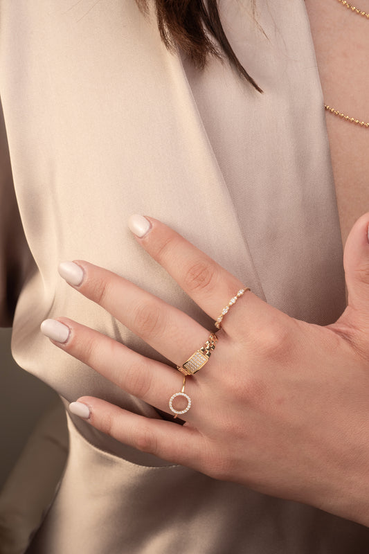 Anillo 10 kilates un brazo delgado y el contorno de un círculo en el centro de zirconias.