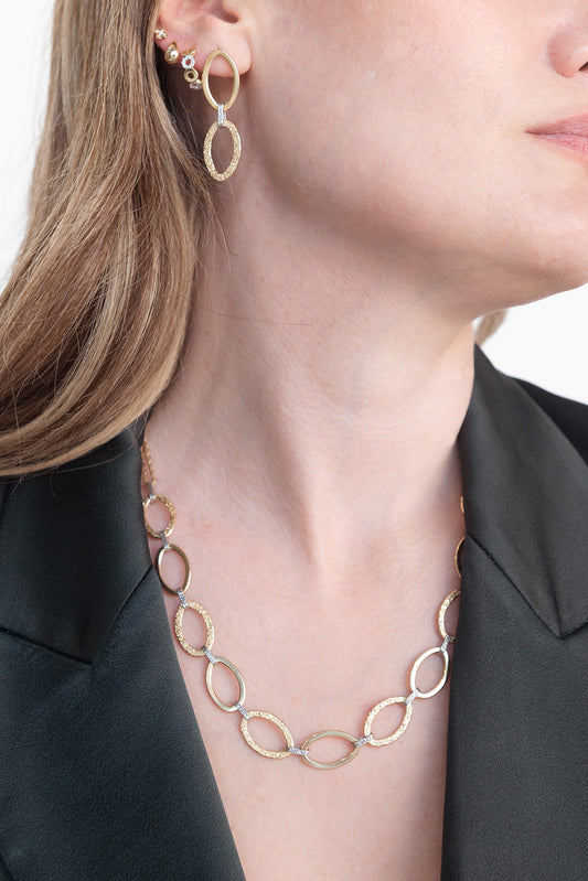 Arracada 14 kilates centro oro amarillo liso, oro blanco textura en puntos y oro rosa con textura.Precio habitual $ 10,795.00Precio habitualPrecio unitario por-