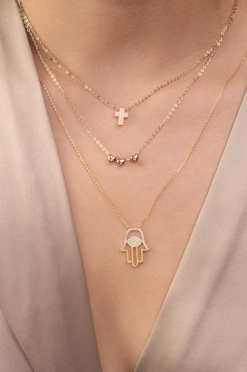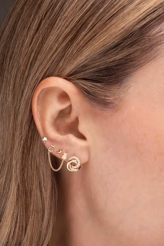 Huggie de oro sólido en 14 kilates con tres aros enlazados, dos lisos y uno con zirconias.