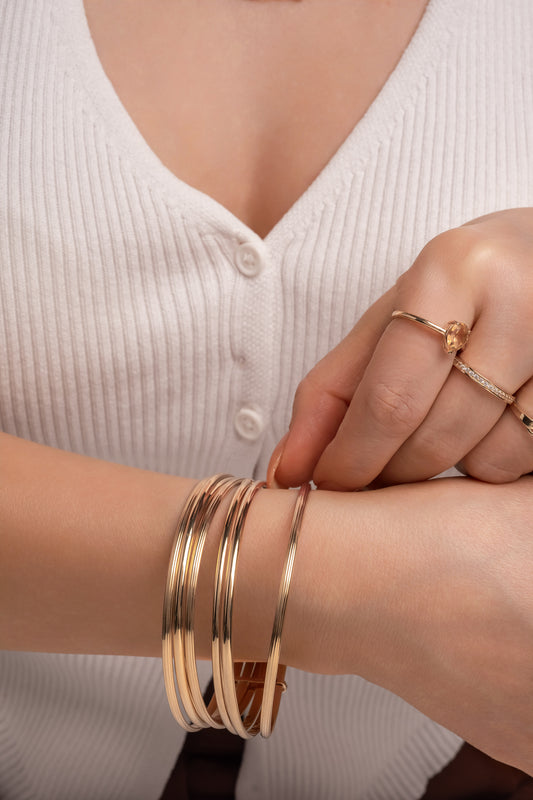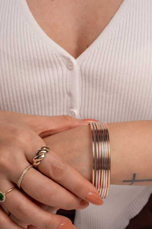 Aro semanario de oro sólido en 14 kilates con siete aros lisos de oro florentino tubulares.