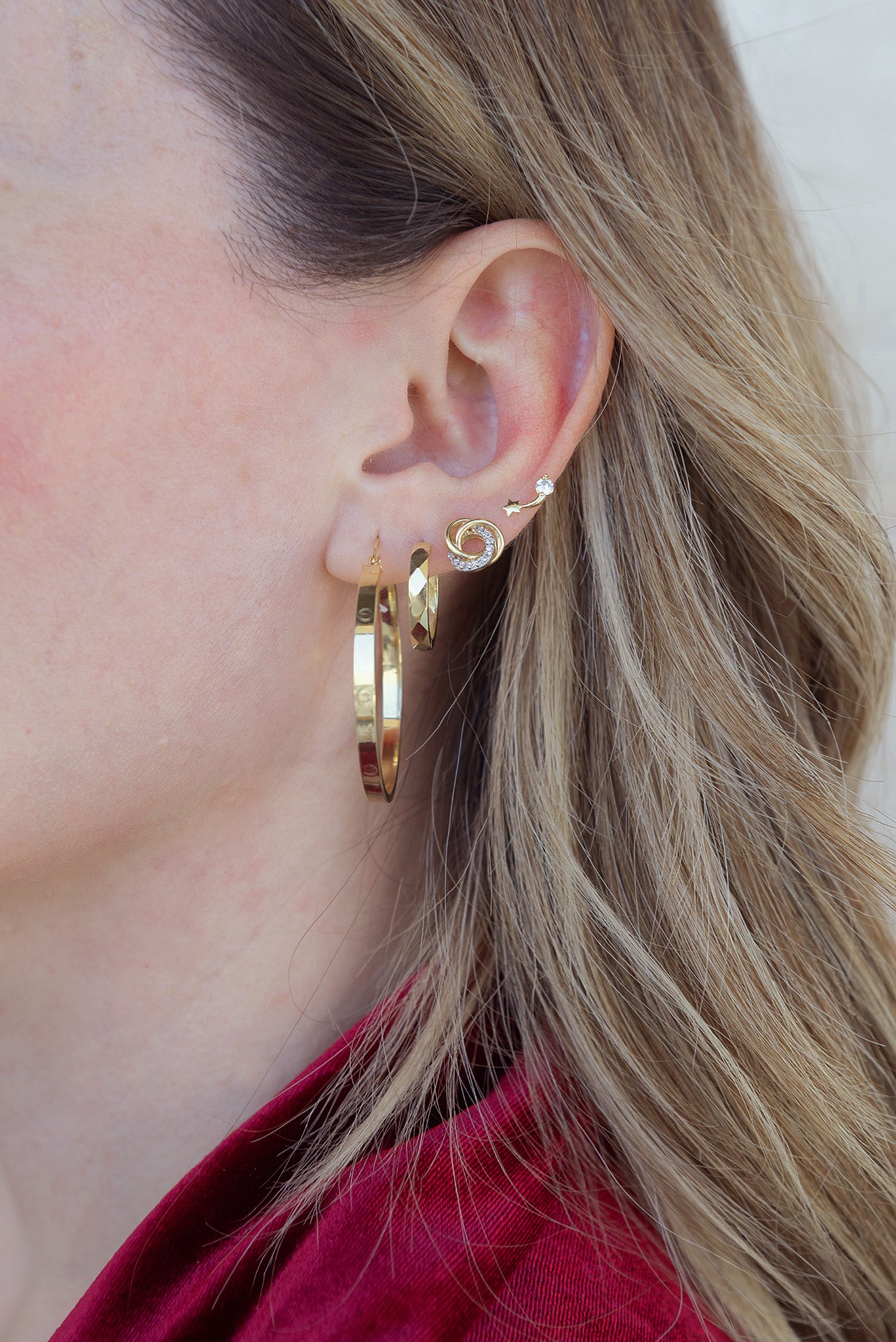 Arracada de oro sólido en 10 kilates con forma delgada y clavos lisos tamaño grande.