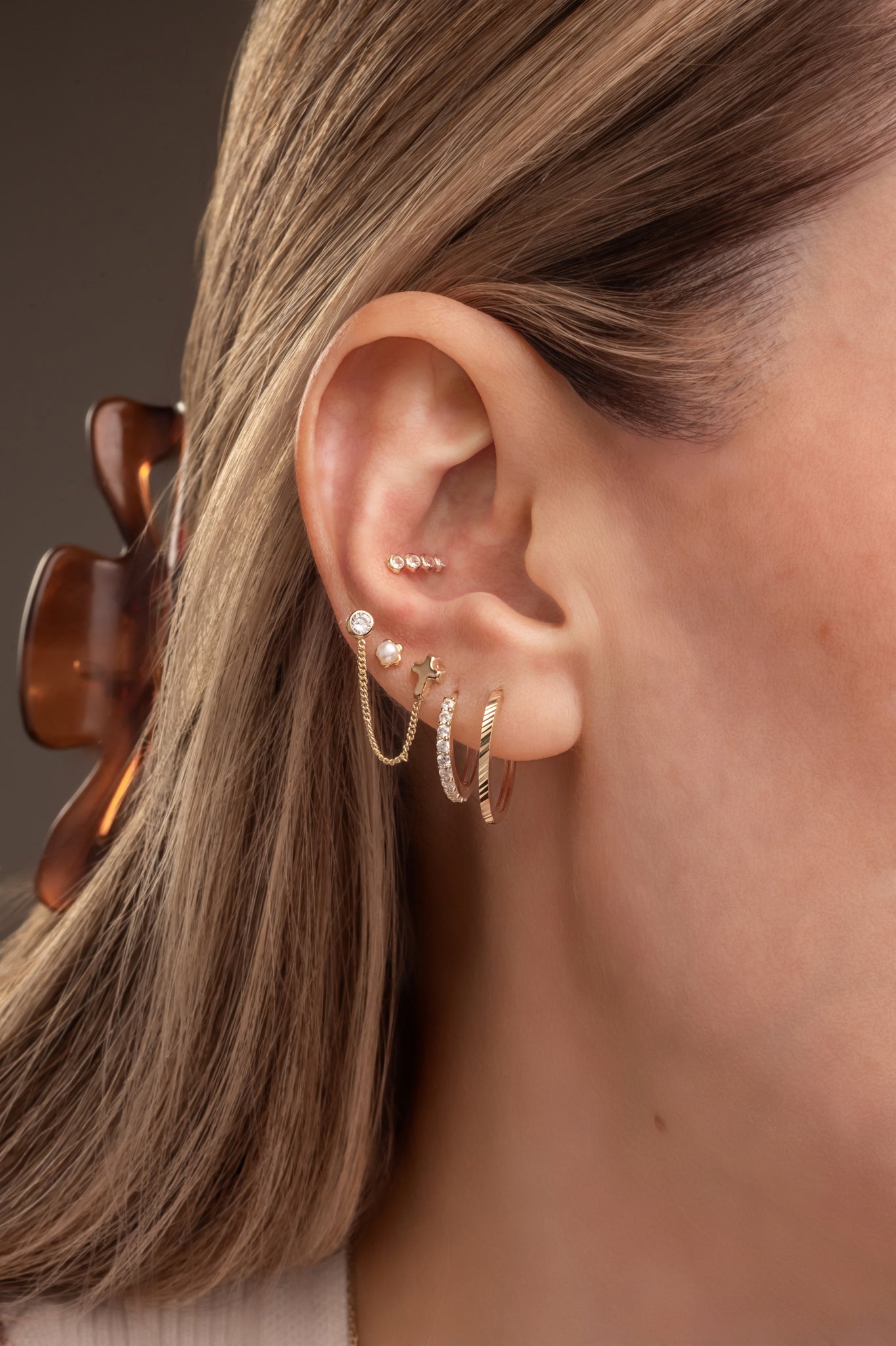 Arracada 10 kilates forma delgada y diamantado en líneas