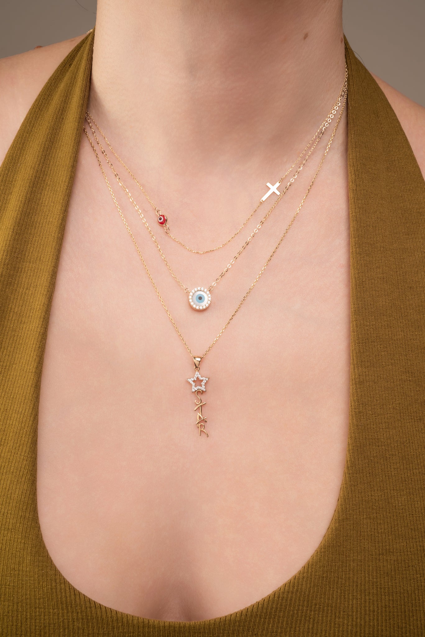 Gargantilla de oro sólido en 10 kilates con dije de ojo en madre perla y contorno zirconias.