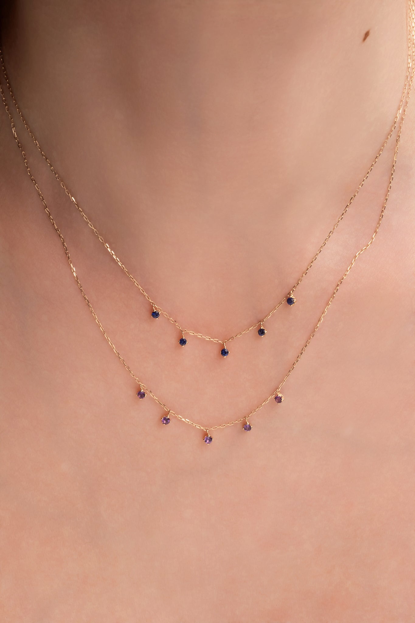 Gargantilla de oro sólido en 14 kilates con cinco zafiros de 2mm colgantes.