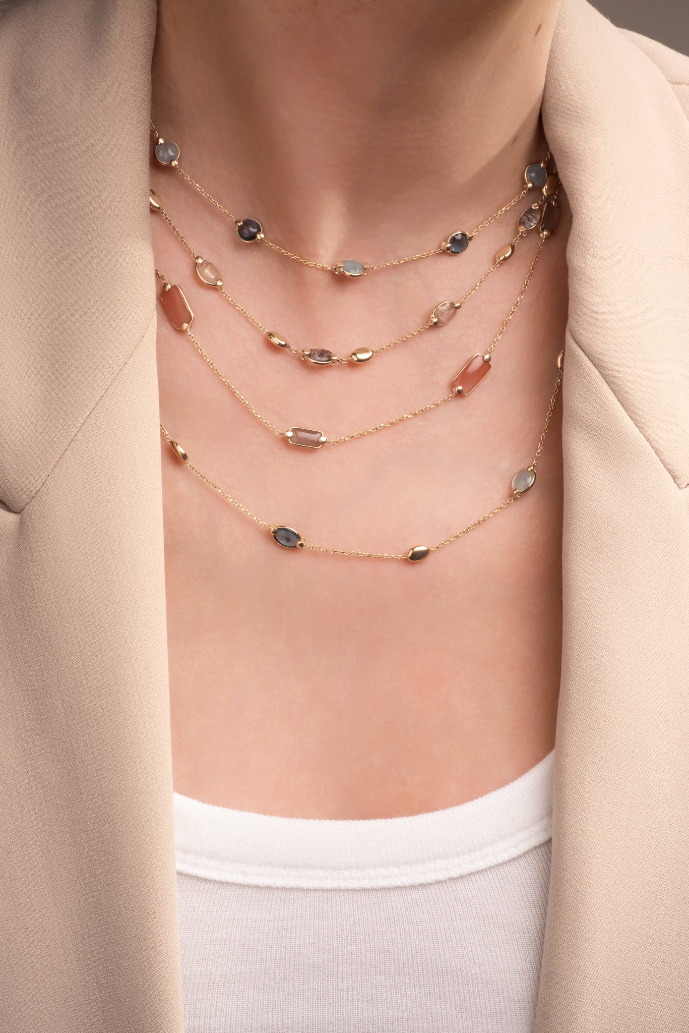 Gargantilla de oro sólido en 14 kilates con dijes de ilolita, aguamarina ovaladas y semillas lisas de oro amarillo.