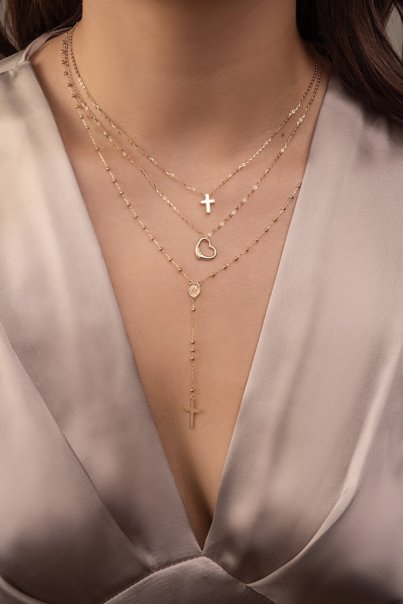 Gargantilla rosario de oro sólido en 10 kilates con bolitas minis lisas y medalla de Virgen de Guadalupe y cruz placa lisa.