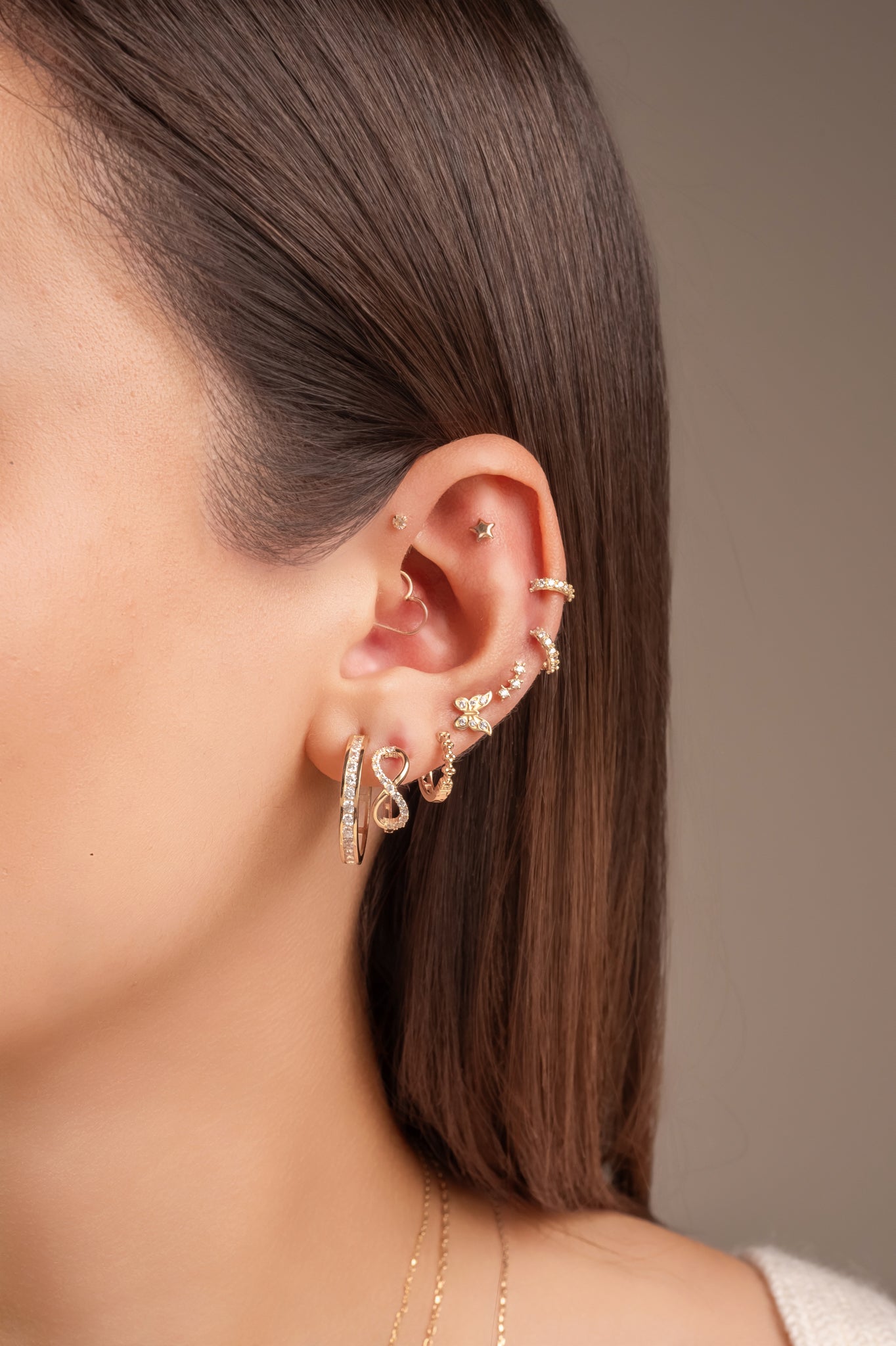 Huggie 10 kilates infinito mitad liso mitad zirconias