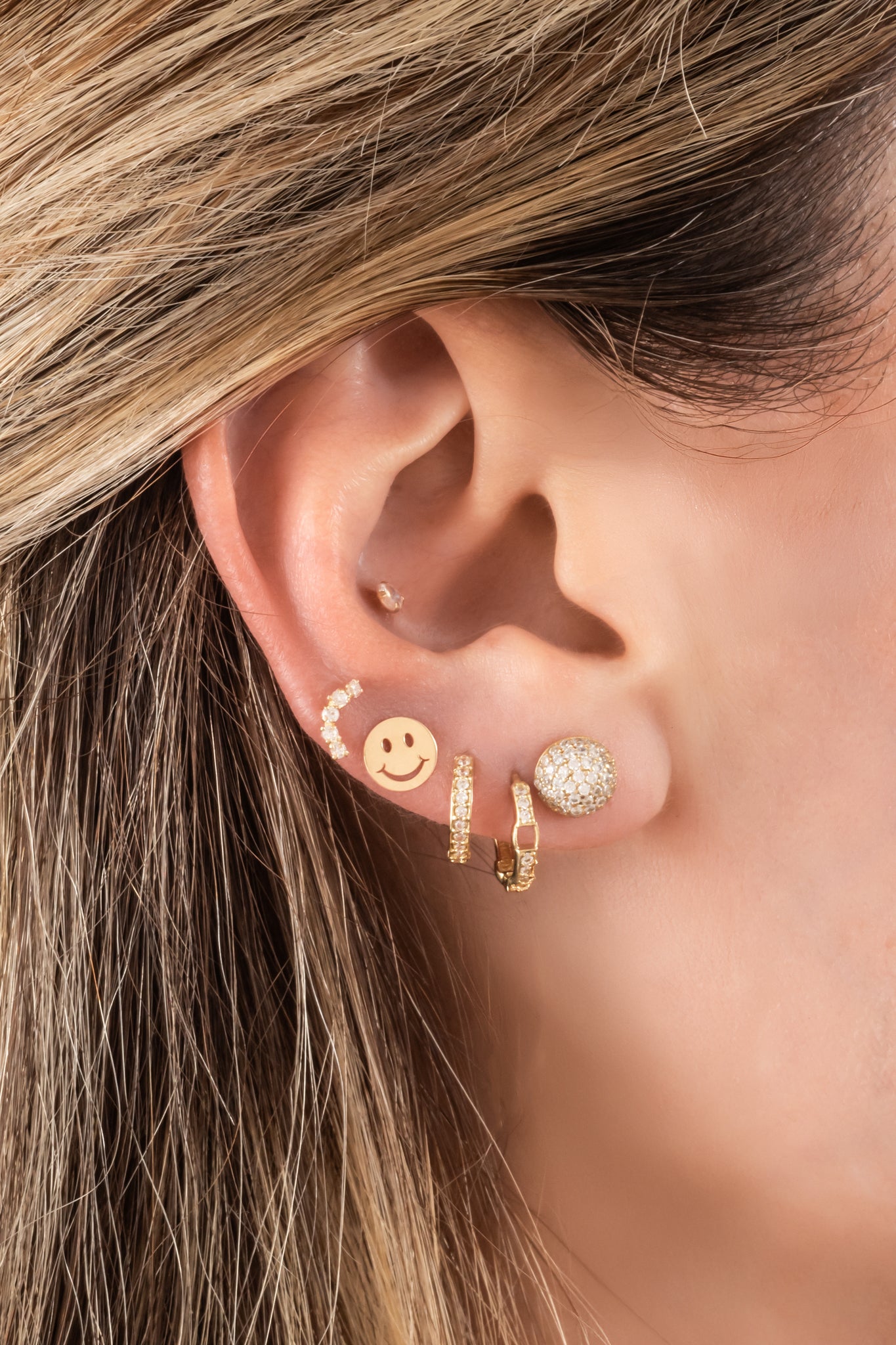 Huggie de oro solido en 10 kilates con un estilo tiffany en parte liso y zirconia
