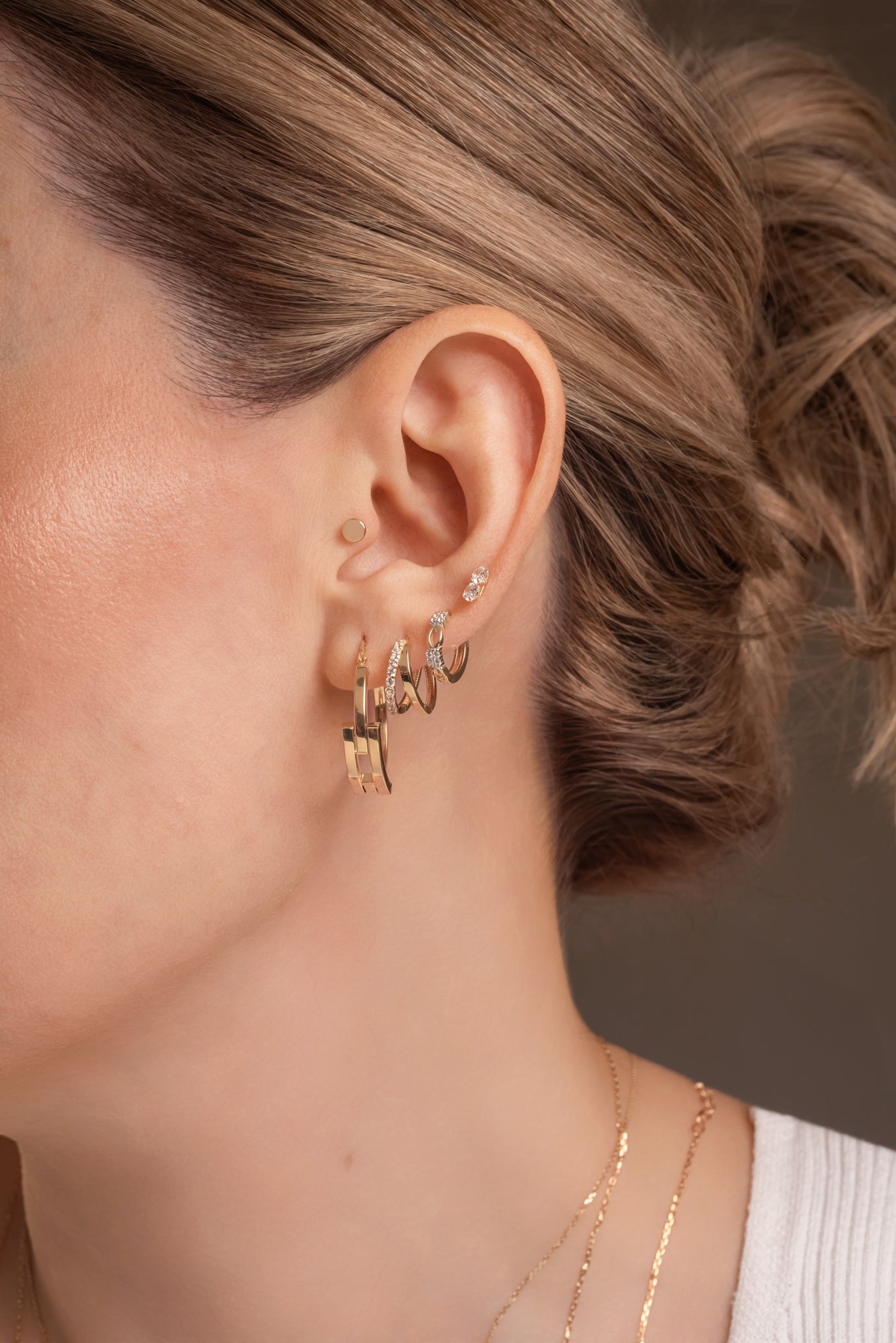 Huggie de oro sólido en 14 kilates con cuadro de zirconias y óvalos huecos lisos.