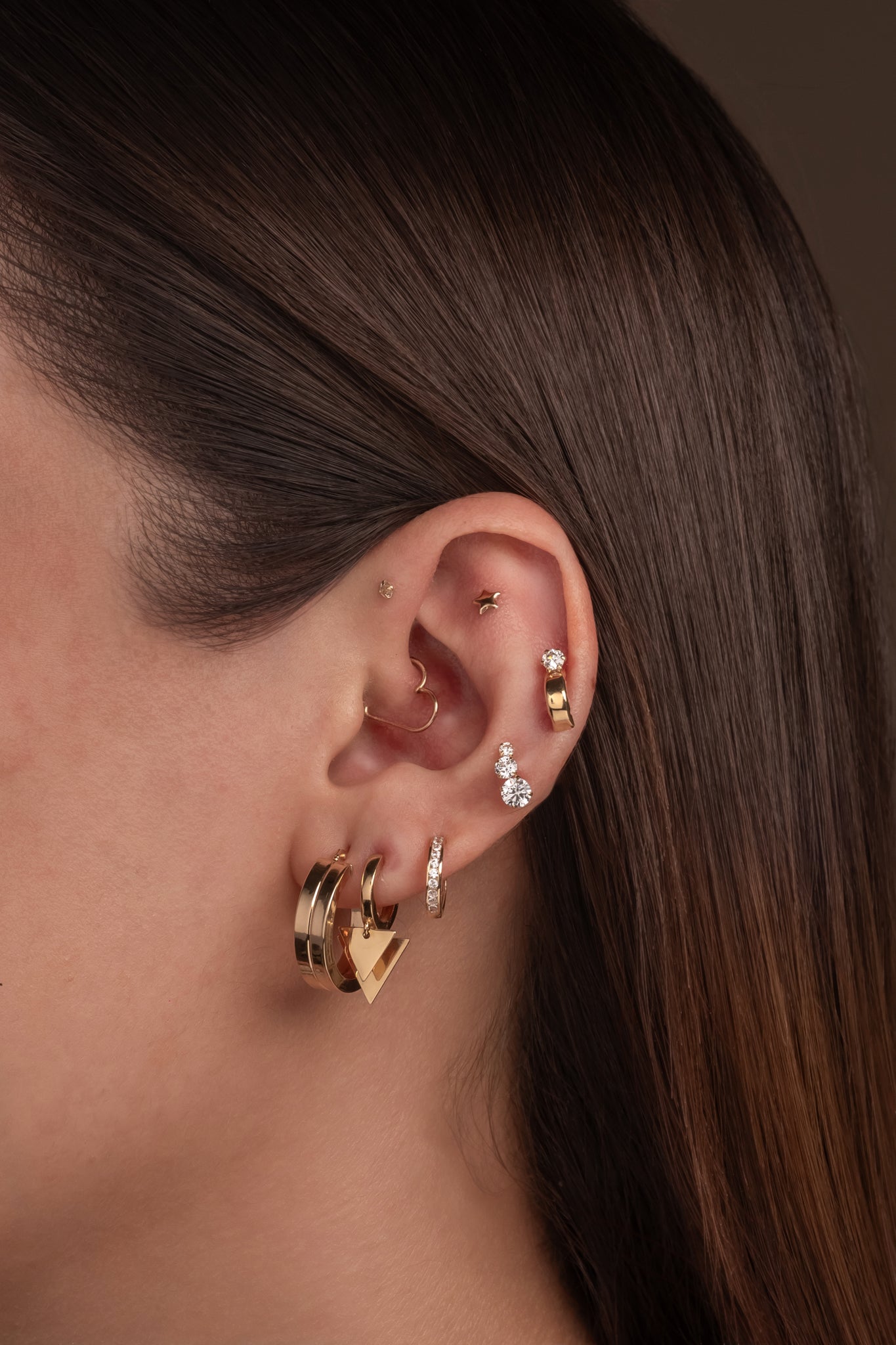 Huggie de oro sólido en 14 kilates con doble tiángulo en placa lisa.